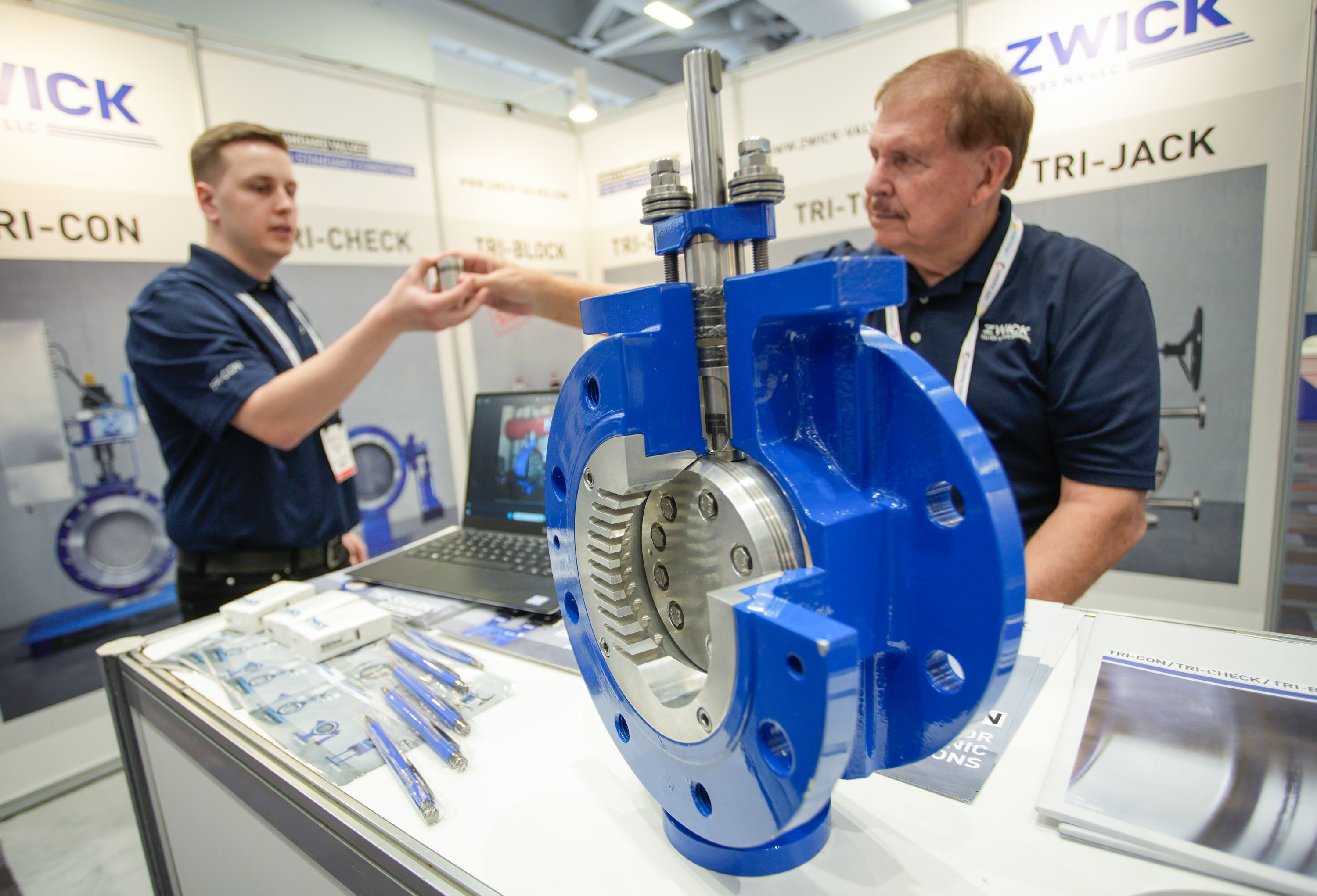 2024年5月7日,在加拿大温哥华举办的2024年加拿大气体能源展览及会议上,参展商展示一个管道天然气阀门单元。新华社发(梁森摄)