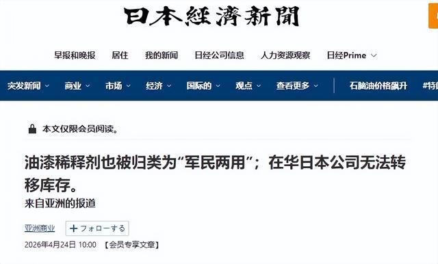 比如,24日《日本经济新闻》透露,继原油、医疗用品和塑料制品等出现短缺之后,日本的油漆稀释剂也陷入供应紧张。日企试图从中国进口,但未能成功,理由是油漆稀释剂也属于两用物项,受到中方严格管控。